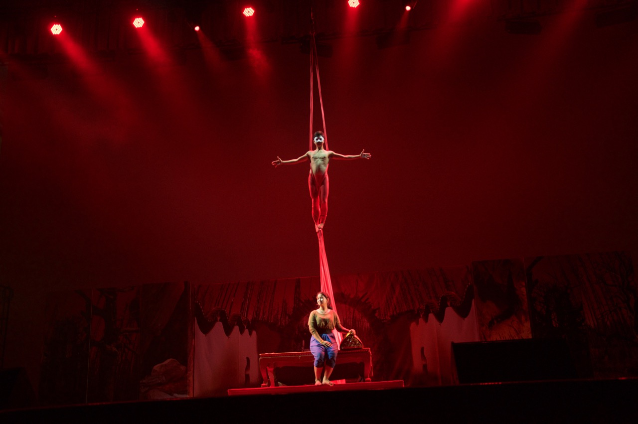 3. The Miracle of the Blood Throne was performed by Makhampom in 2013 to commemorate the October Event 1970s democracy movement. It combined the likay and aerial circus forms and was a transformative performance for Makhampom, as the largest audience reach as well as subject to vigilante and military threats and intimidation.