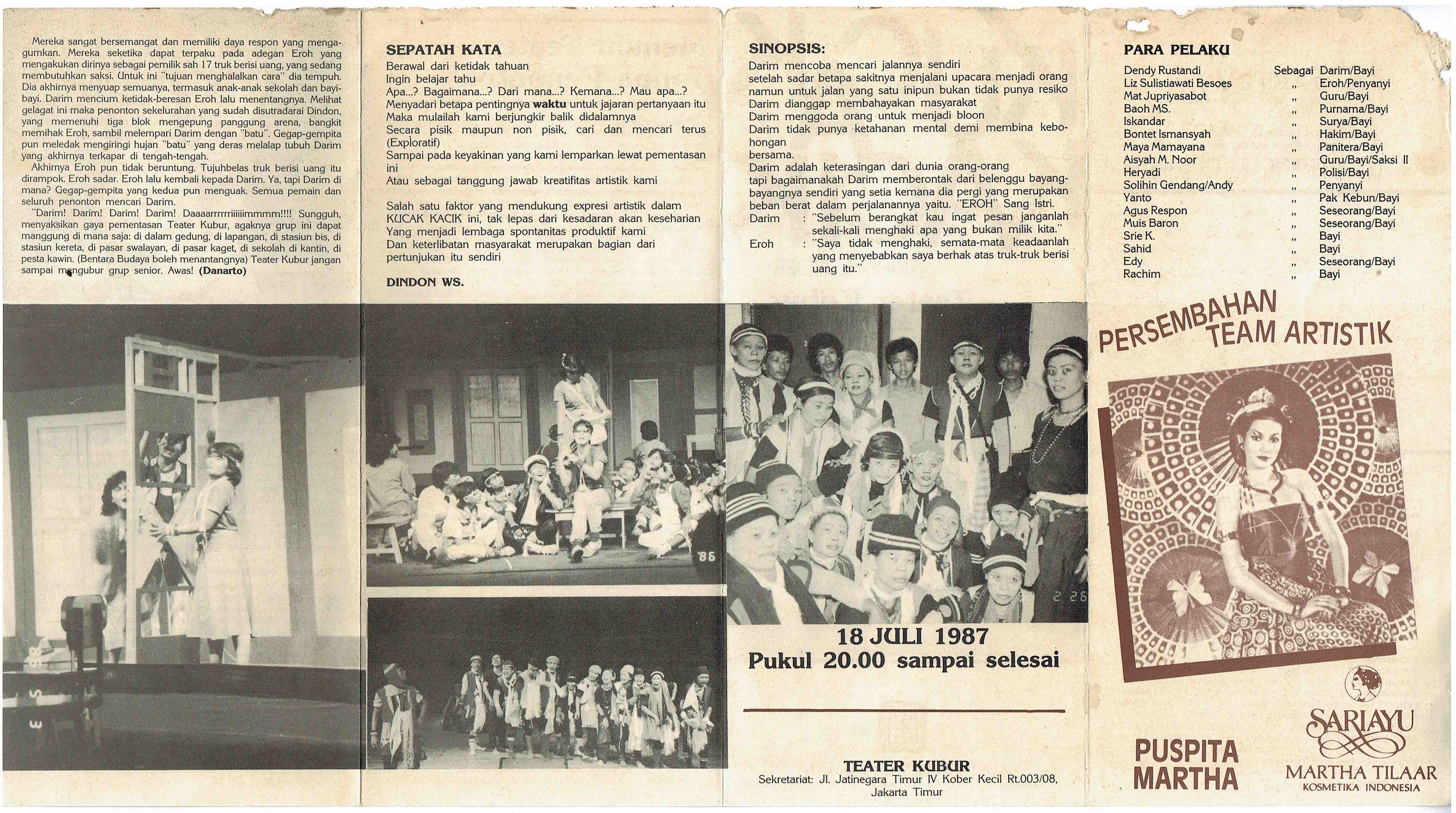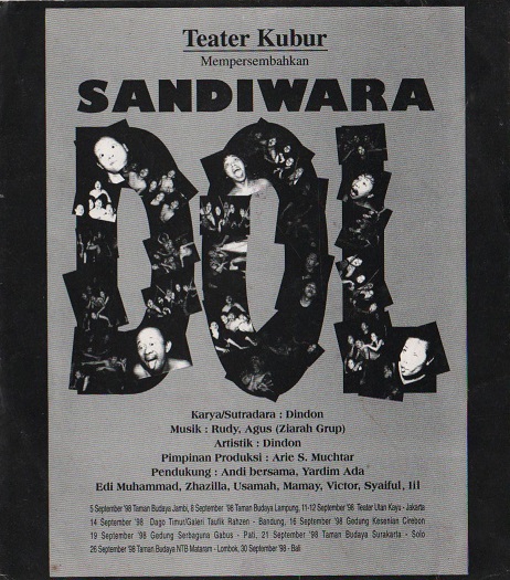 Teater Kubur is an avant-garde theater throughout the 1990s to the post-Suharto Era. Its root in a lower kampung marked the group’s difference compared with most modern theater groups. Established in 1983 by Dindon W.S., who lives (till now) in “Kampung Kober” of Eastern Jakarta, near a cemetery (kuburan), the group called itself Teater Kubur. During the days, members of the group work as high school students, construction workers, auto mechanics, auto painters… all of whom lived in Kampung Kober. Its main rehearsal space was on the actual cemetery grounds, too.