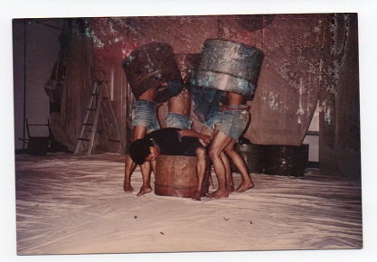 Local kampung residents often watched their rehearsals on the cemetery grounds. They were accepted as a part of the community. Teater Kubur has gained a great success and reward within few years’ training, but the Director wants to distance himself from the any institutions. Thus they choose not to perform at big venues but tour to kampungs, youth centers, and university campuses. They do not use scripts by avant-garde writer. Rather they use exploratory method-improvisations by the actors with materials from their immediate environments, such as nets and large metal storage drums. Actor use languages, idioms, and images most familiar to them, such as the daily language for those on the margins. Dindon said that his group used the idioms of the kampung so that residents could understand and appreciate Kubur’s experimental performances and idioms.